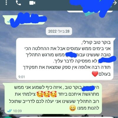 הייתי מסכמת את זה בתודה – תודה על הזכות להיות שם בשבילה ולהעביר אותה תהליך משמעותי שכלל, שיחת אינטק, ועוד 21 יום משימתיים, ואז יום ארוך של 11 שעות רצופות עם סדרת תהליכי NLP ששינו את חייה.